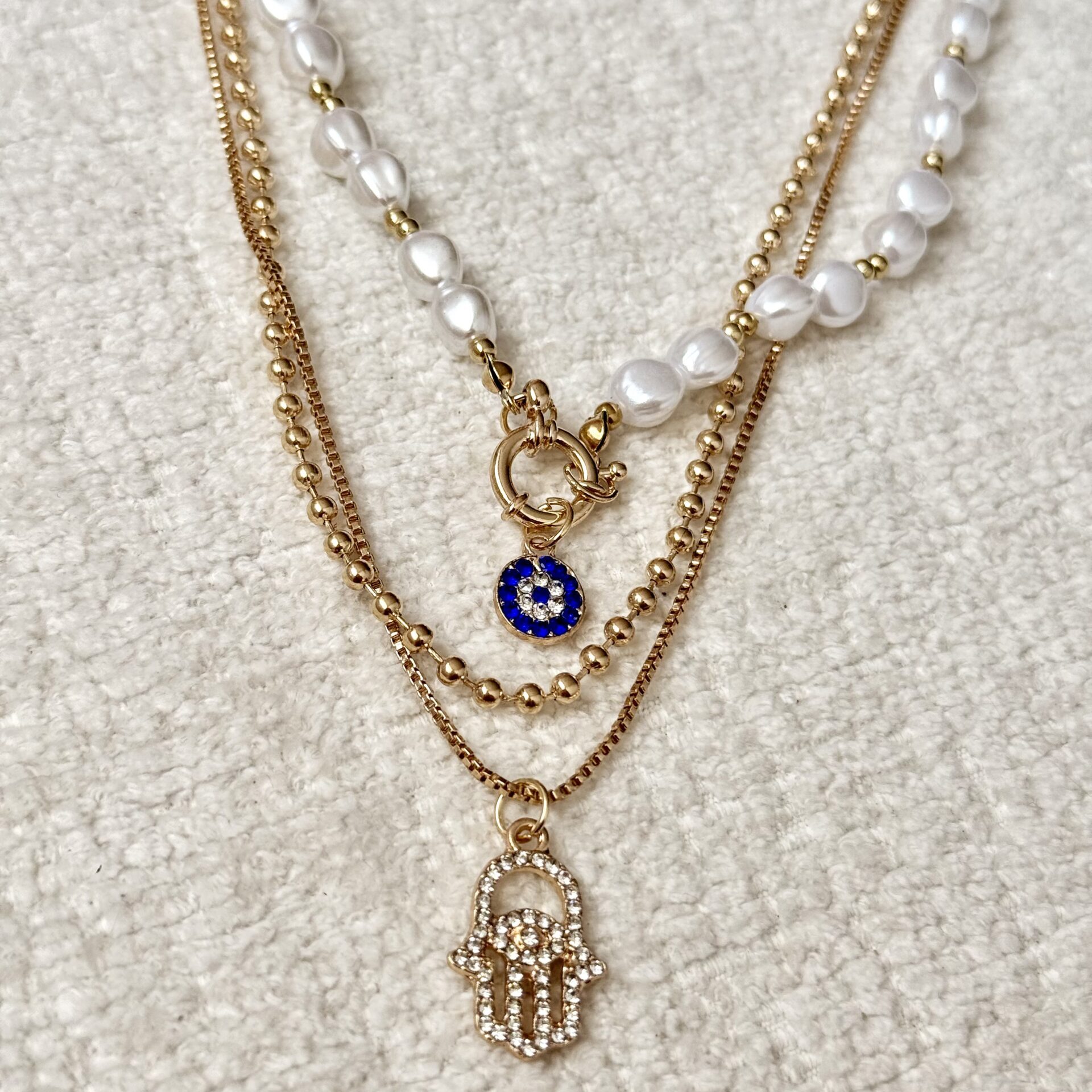 Collar doble que combina perlas irregulares y cadenas finas con dijes simbólicos de protección.